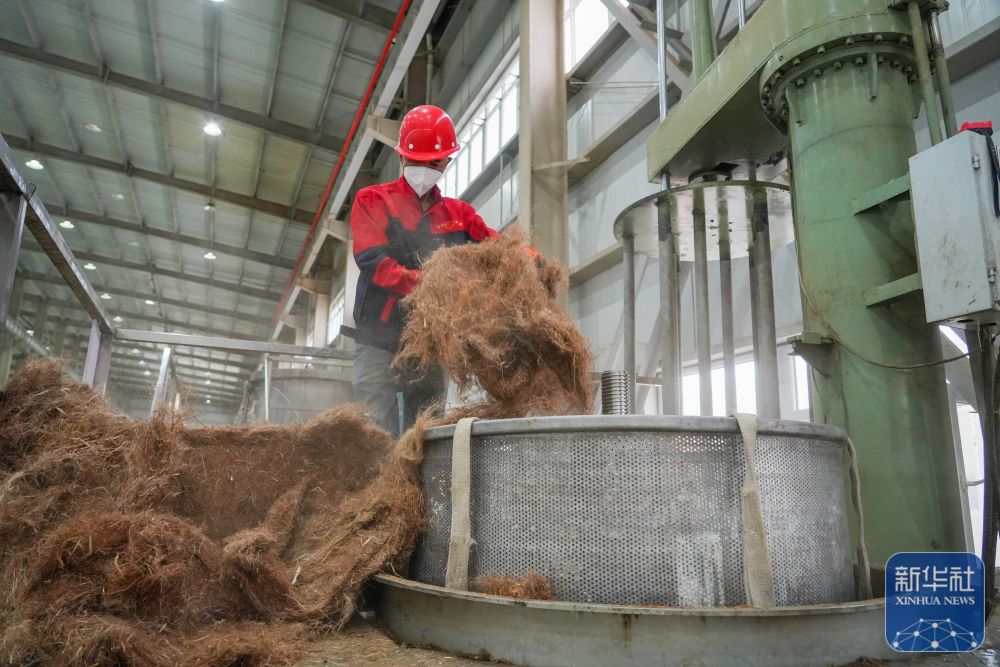 ↑ 9月20日,在新疆尉犁一家服装公司的罗布麻纤维脱胶车间,工人加工原材料。新华社发(汪志鹏 摄)