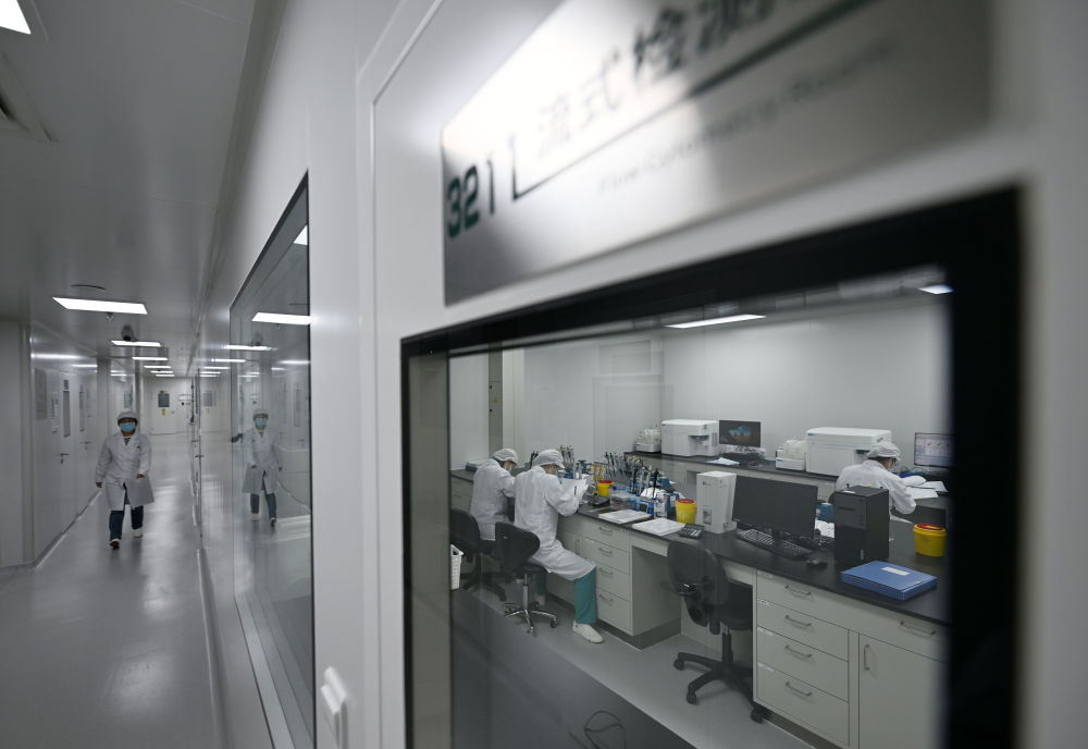 合源生物科技(天津)有限公司工作人员在生产基地的检测室进行检测。新华社记者 赵子硕 摄