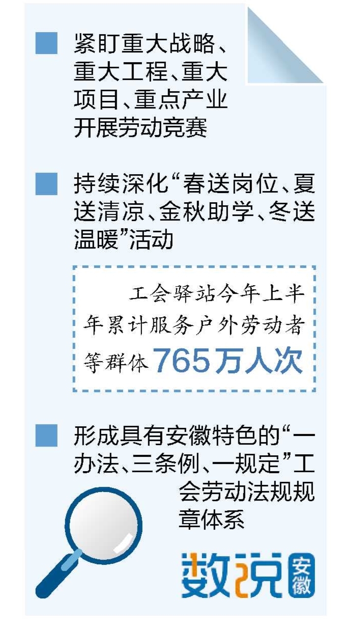 以法治之力守护职工权益。目前,我省已出台具有安徽特色的“一办法、三条例、一规定”,即《安徽省实施〈中华人民共和国工会法〉办法》《安徽省企业民主管理条例》《安徽省集体合同条例》《安徽省工会劳动法律监督条例》《安徽省女职工劳动保护特别规定》,形成地方工会劳动法规规章体系,为维护职工合法权益提供有力法治保障。省总工会积极构建“工会+法院+检察院+人社+司法”一体化维权模式,对违反劳动法律法规、侵害职工权益的行为,及时发出工会劳动法律监督《提示函》和《意见书》《建议书》。