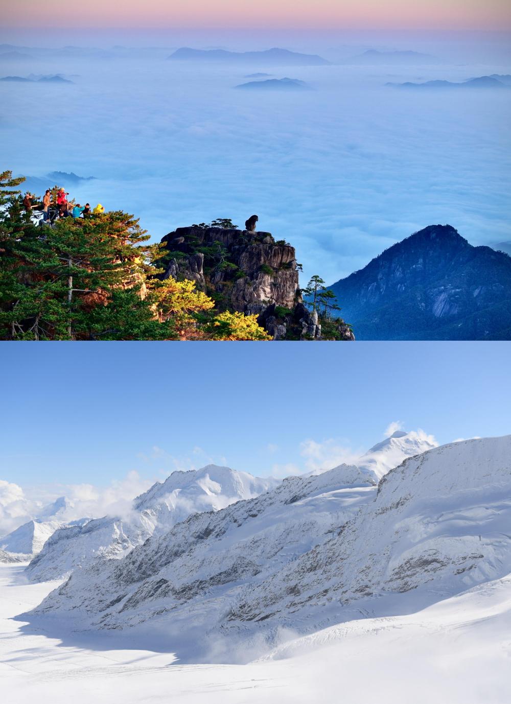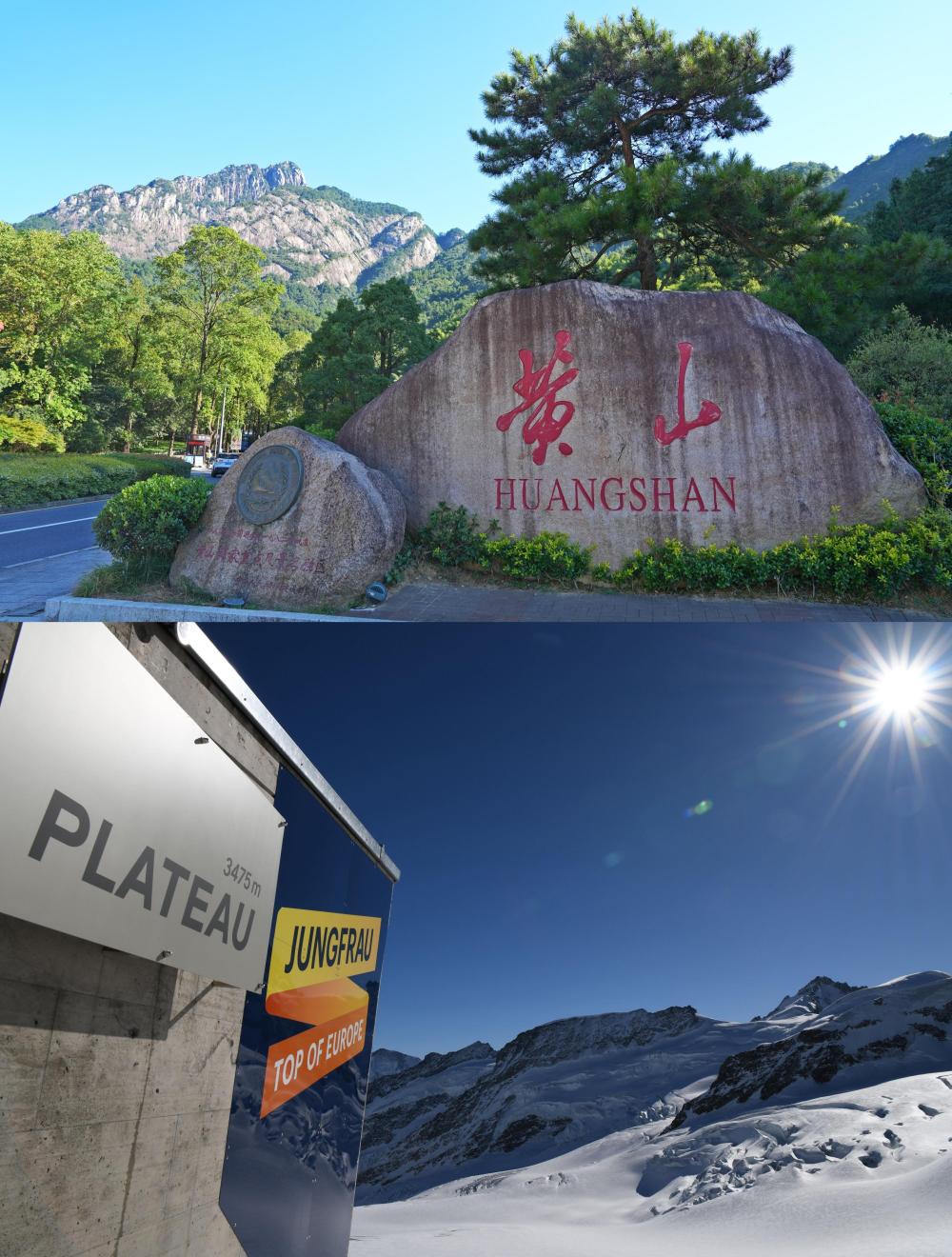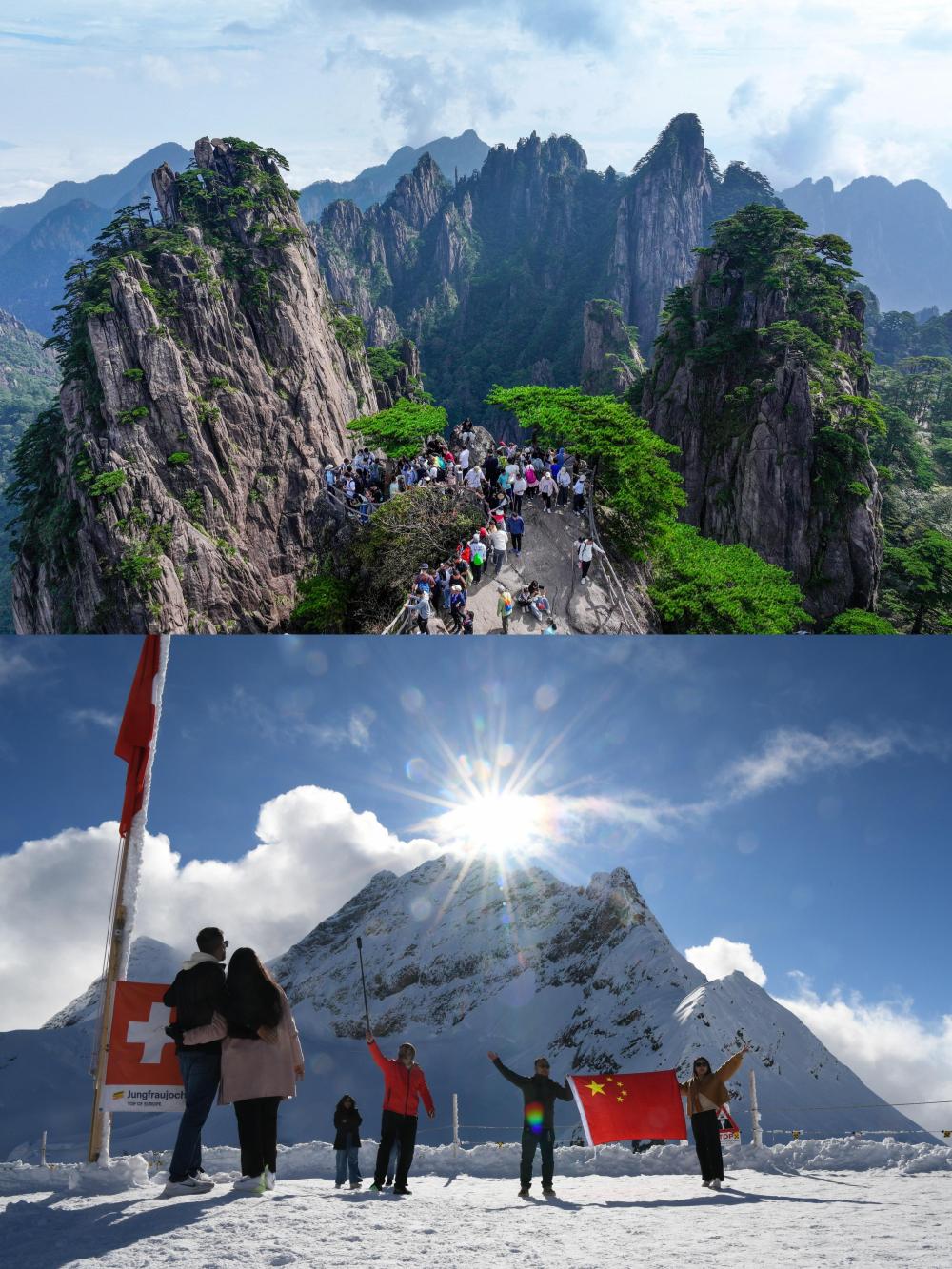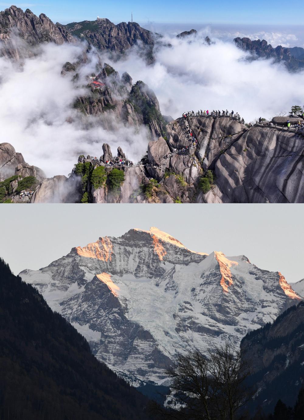 上图为2025年8月29日拍摄的安徽省黄山风景区南大门(新华社记者 郭晨 摄);下图为2023年2月14日拍摄的海拔3475米的瑞士少女峰冰川观景台(新华社记者 连漪 摄)。