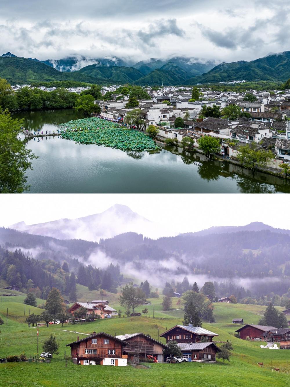 上图为2023年9月13日拍摄的安徽省黄山市黟县宏村(无人机照片,新华社记者 郭晨 摄);下图为2024年10月1日拍摄的瑞士少女峰地区秋景(新华社记者 连漪 摄)。