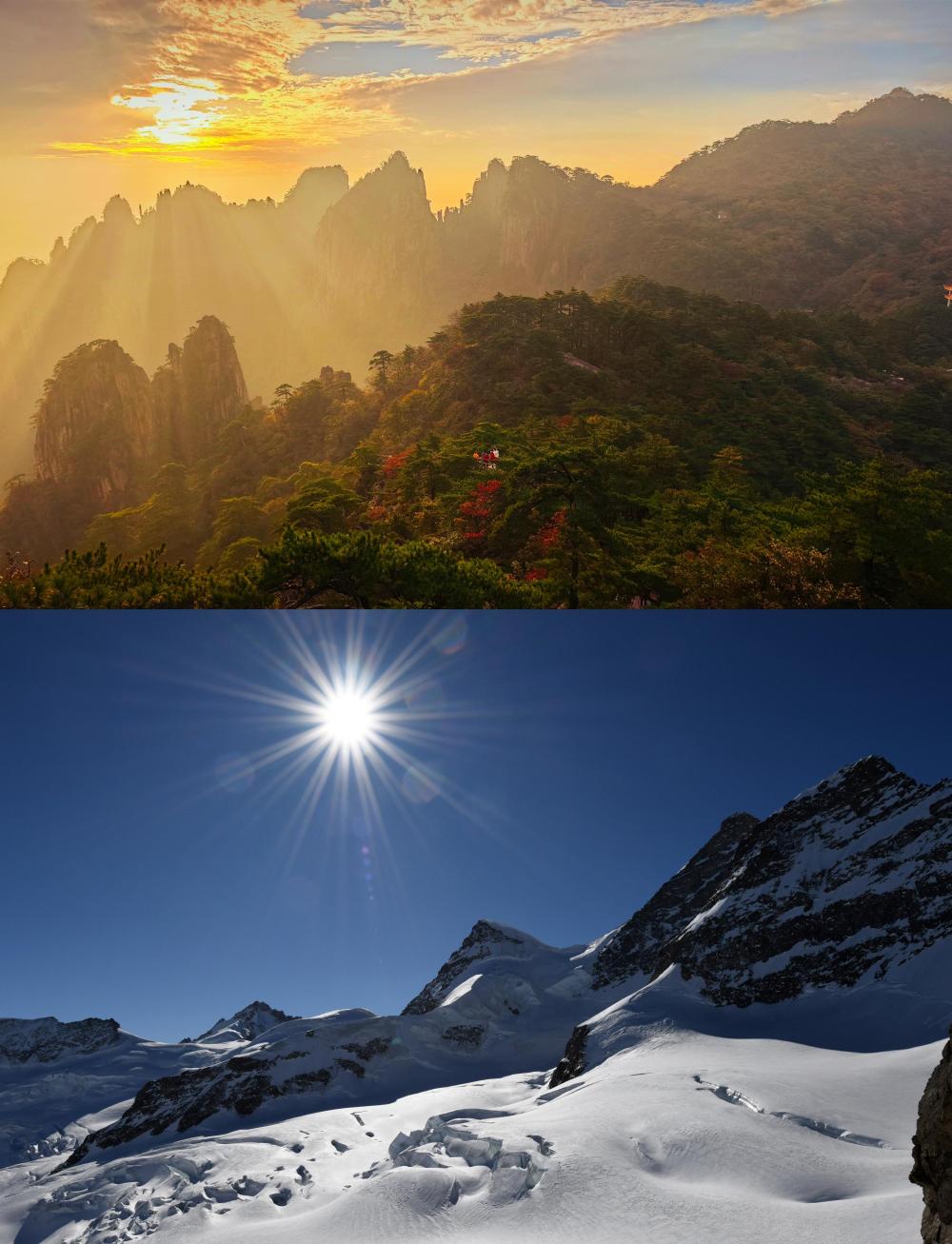 上图为2024年10月9日拍摄的安徽省黄山秋色(新华社发 丁家庆 摄);下图为2023年2月14日在海拔3571米的瑞士少女峰斯芬克斯观景台拍摄的阿莱奇冰川(新华社记者 连漪 摄)。