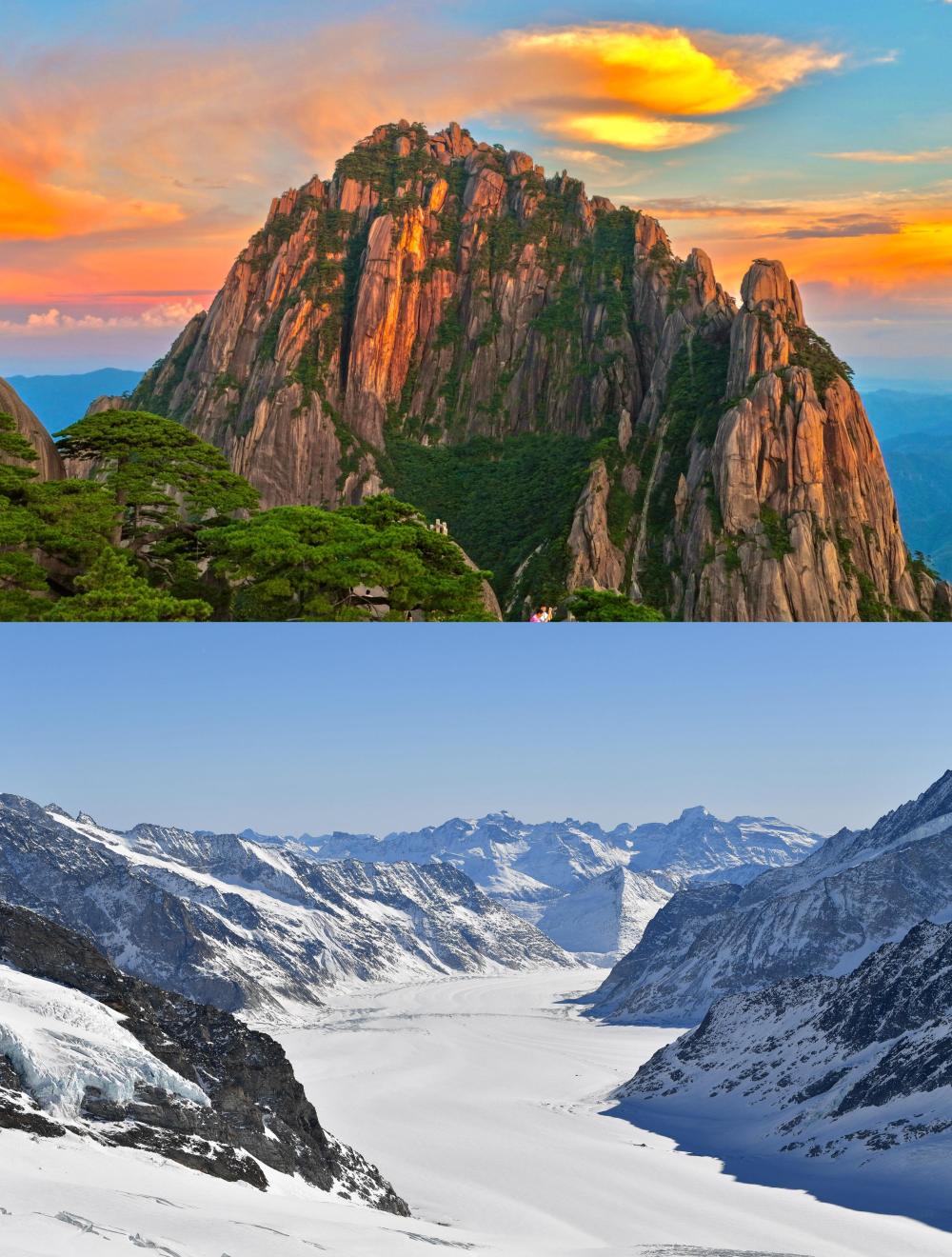 上图为2025年8月26日拍摄的安徽省黄山风景区的天都峰和迎客松(新华社发 候瑞冬 摄);下图为2025年2月14日在海拔3571米的瑞士少女峰斯芬克斯观景台拍摄的阿莱奇冰川(新华社记者 连漪 摄)。