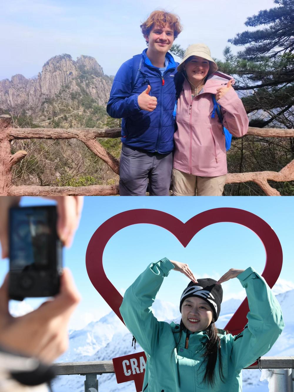 上图为2025年4月5日,两名外国游客在安徽省黄山风景区合影(新华社发 解传光 摄);下图为2025年9月27日,中国游客在海拔3475米的瑞士少女峰冰川观景台拍照留影(新华社记者 连漪 摄)。