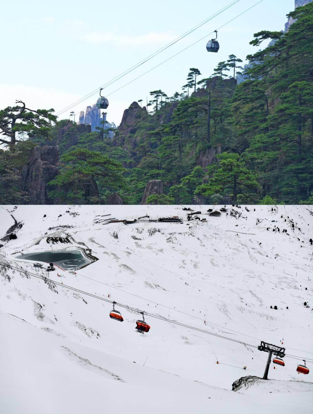上图为2025年8月29日拍摄的安徽省黄山风景区云谷索道(新华社记者 郭晨 摄);下图为2023年1月12日在瑞士少女峰地区拍摄的滑雪缆车(新华社记者 连漪 摄)。