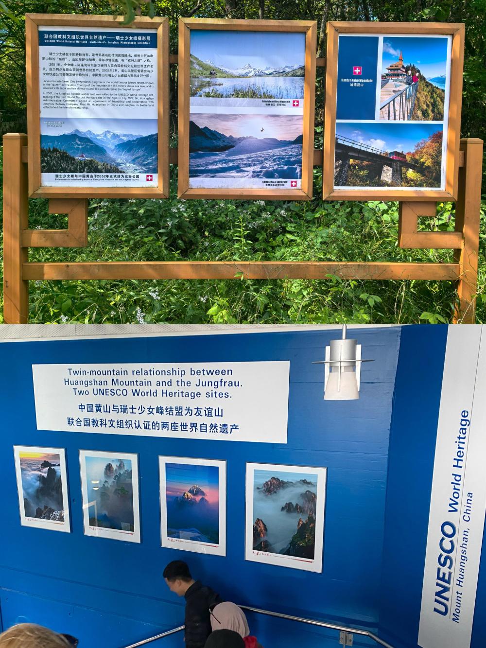 上图为2025年8月28日在安徽省黄山风景区天海广场拍摄的少女峰图片展(新华社发 黄睿 摄);下图为2023年8月26日在海拔3475米的瑞士少女峰冰川观景台外拍摄的黄山展板(新华社记者 连漪 摄)。