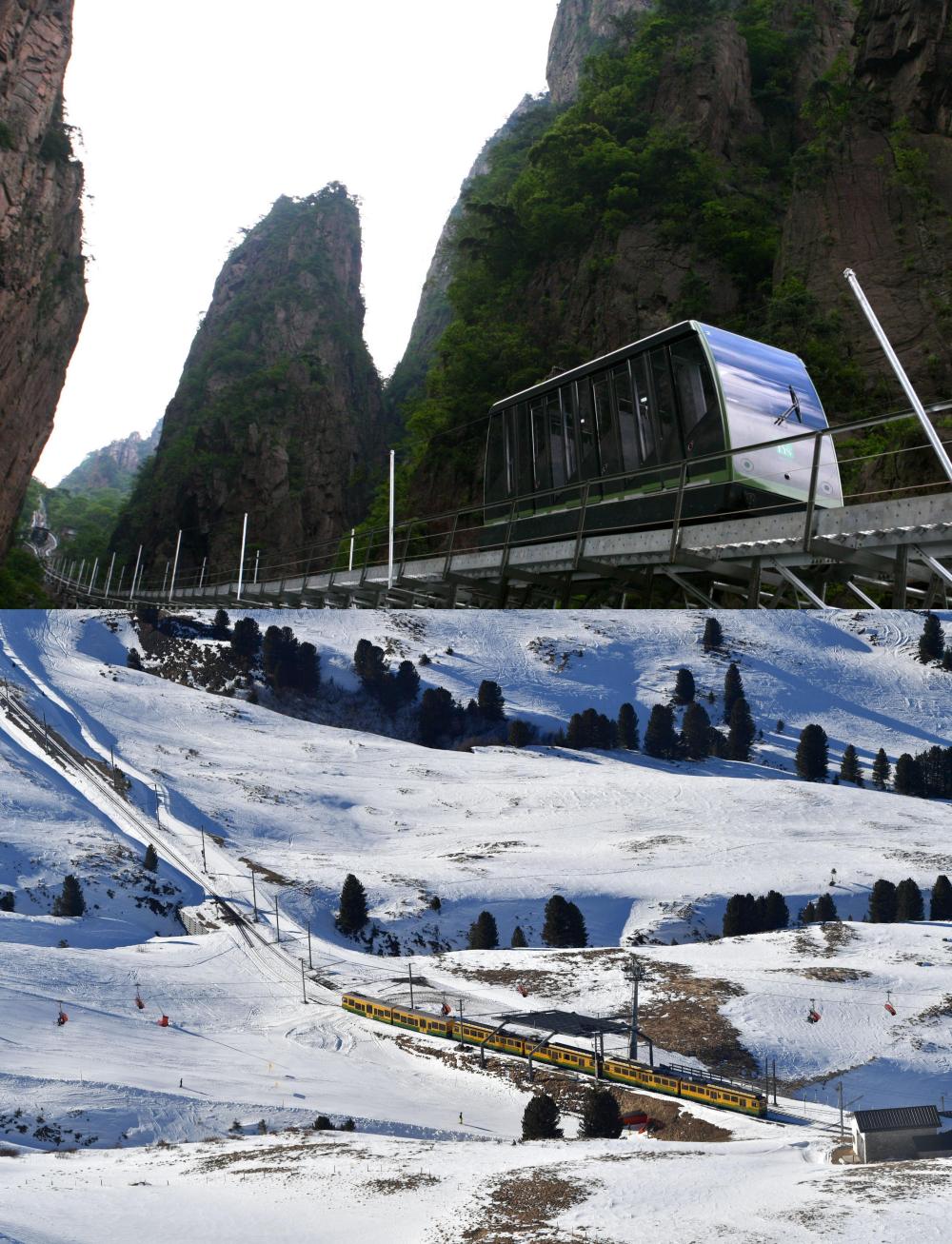 上图为安徽省黄山风景区西海大峡谷观光缆车(新华社发 施亚磊 摄);下图为2023年2月14日,火车在瑞士少女峰地区的山间穿行(新华社记者 连漪 摄)。