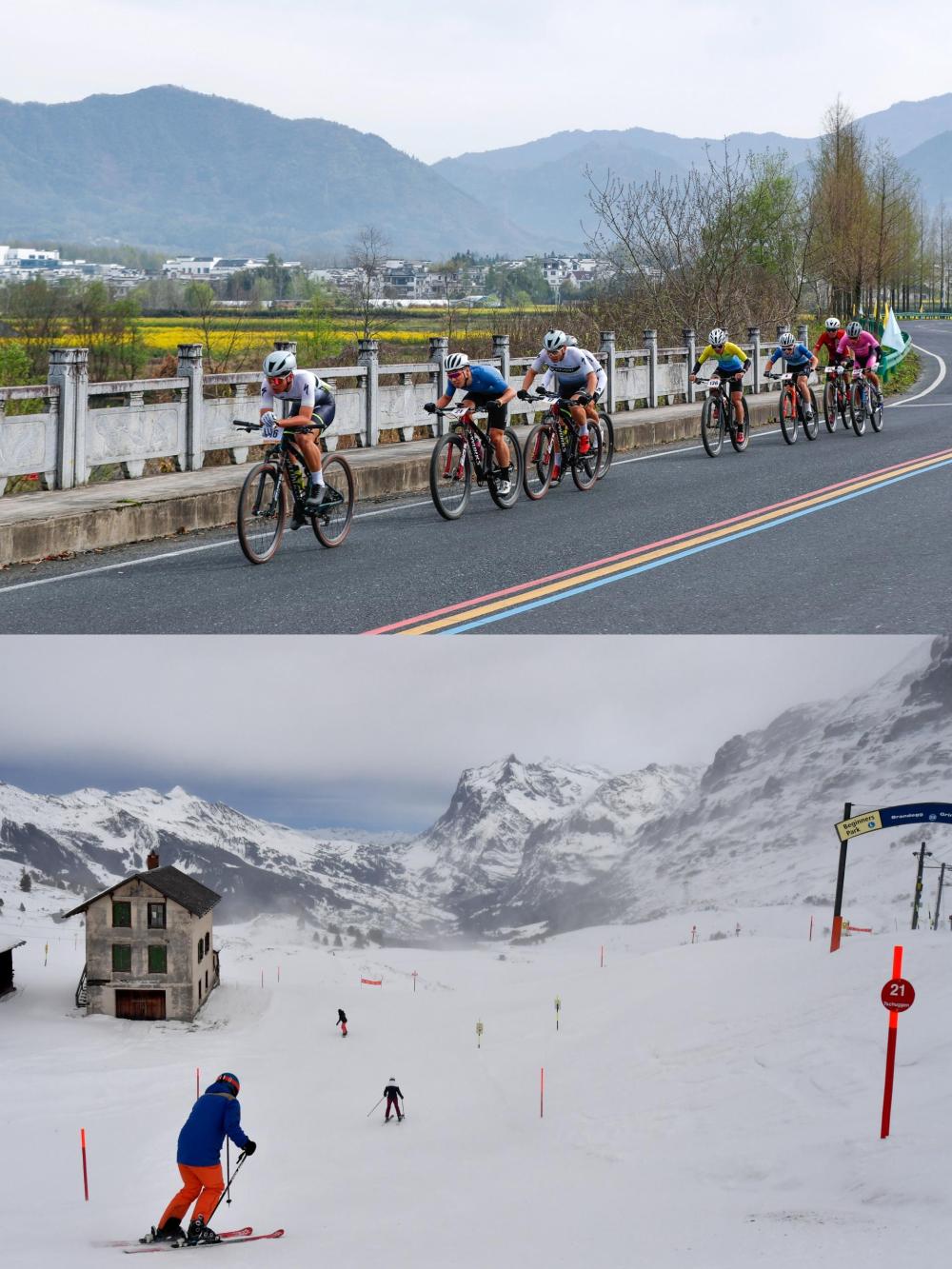 上图为2024年3月30日,第十九届中国黄山(黟县)自行车公开赛山地组比赛在黄山所在的安徽省黄山市举行(新华社发 施亚磊 摄); 下图为2023年1月12日,人们在瑞士少女峰克莱纳谢德格的滑雪场滑雪(新华社记者 连漪 摄)。