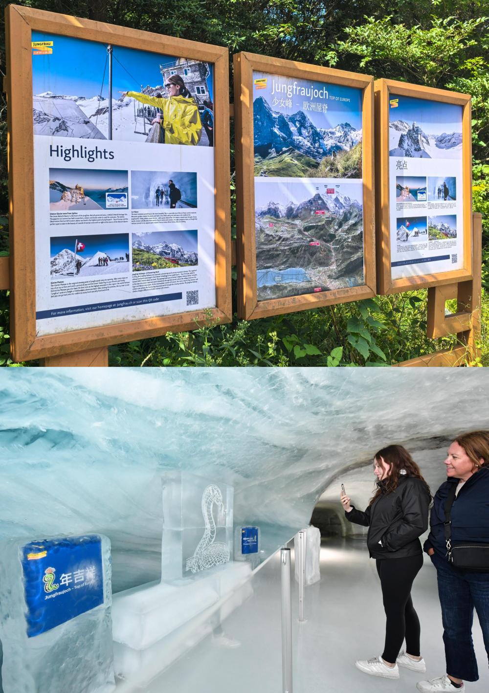 上图为2025年8月28日在安徽省黄山风景区天海广场拍摄的瑞士少女峰图片展(新华社发 黄睿 摄);下图为2025年8月28日,游客在海拔3454米的瑞士少女峰冰宫参观为庆祝中国蛇年而设立的冰雕(新华社记者 连漪 摄)。