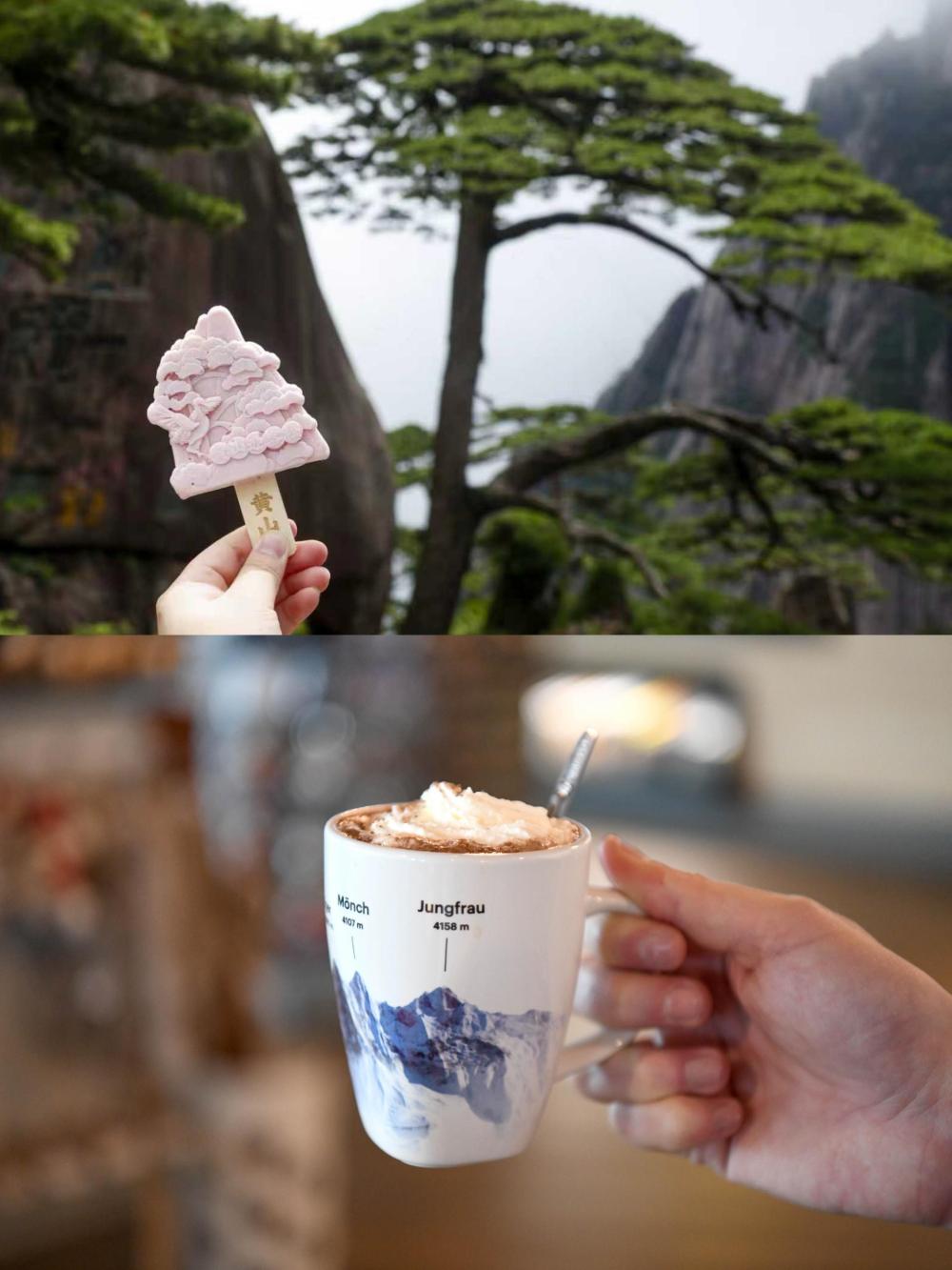 上图为2022年7月8日,游客在安徽省黄山风景区迎客松前手拿迎客松文创雪糕(新华社发 施亚磊 摄);下图为2023年1月12日,游客在瑞士少女峰的咖啡店里展示印有少女峰图案的咖啡杯(新华社记者 连漪 摄)。