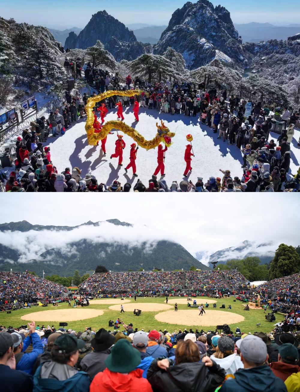 上图为2025年1月27日,雪后的安徽省黄山风景区内正在进行传统舞龙表演(无人机照片,新华社发 施亚磊 摄);下图为2023年8月27日,人们在瑞士因特拉肯的阿尔卑斯山牧羊人节上观看传统摔跤比赛(新华社记者 连漪 摄)。