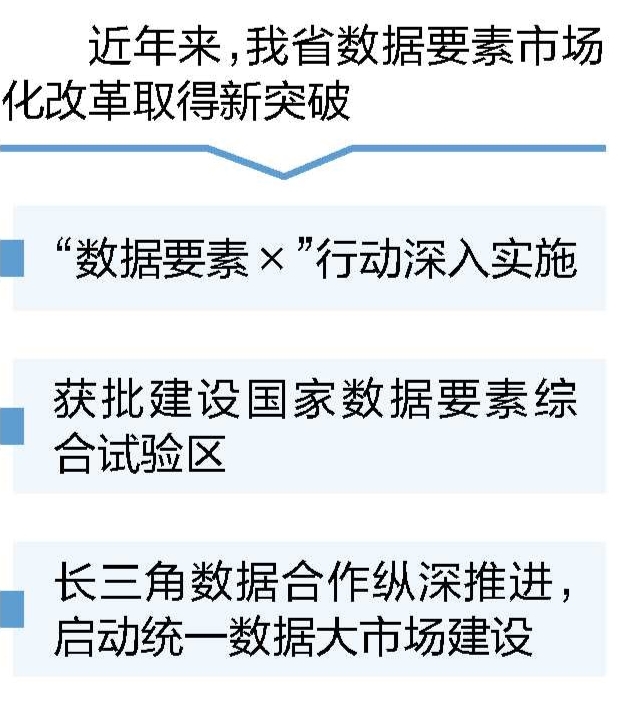 我省发放全国第一张数据产权登记证书。公共数据运营方面,首创“赛道+合伙人+场景”运营机制,按照“一场景一方案一评审”流程,完成12个场景申报,上线153个公共数据产品,累计对外服务应用超600万次。建设行业数据专区,已上线人工智能、新能源和智能网联汽车、公共数据、算力、气象、中医药六大行业专区,助推产业升级。在全国率先探索数据资产作价入股,落地全国首例数据资产作价入股……近年来,我省数据要素市场化改革取得新突破。“数据要素×”行动深入实施,我省获批建设国家数据要素综合试验区,长三角数据合作纵深推进,启动统一数据大市场建设。省数据交易所挂牌运营,率先开展企业数据产权登记试点,首创“数据券”、数据众创空间,公共数据开发利用场景入选国家数据局跑起来示范场景数量位居前列。