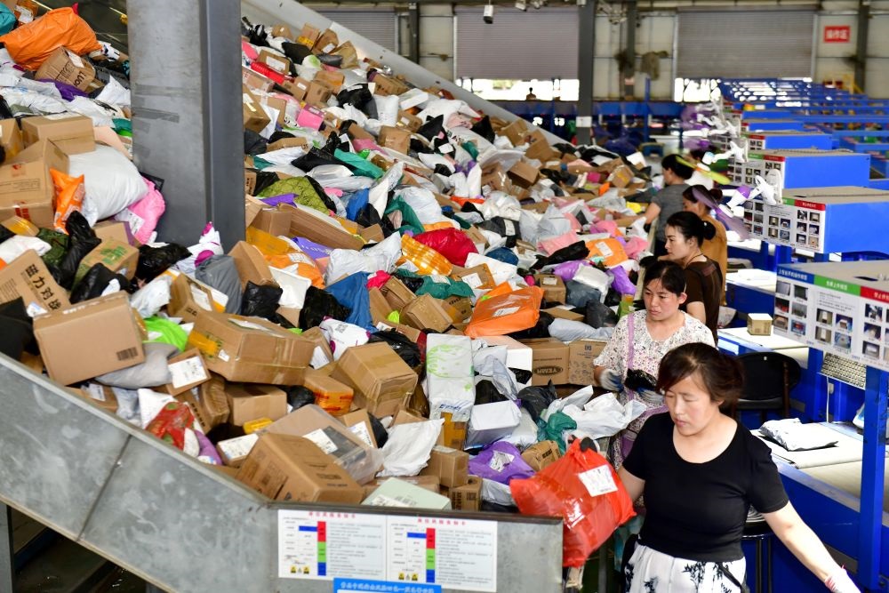 2025年6月18日,在山东省曹县电子商务物流公共服务中心,工作人员在分拣快递。新华社记者 郭绪雷 摄