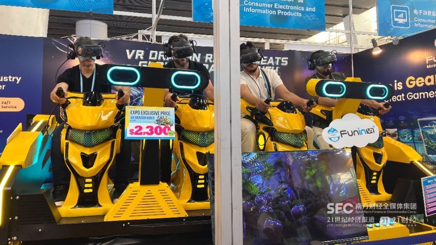 (卓远展位上,外国客商正在体验新款VR游乐设备。 本报记者郑玮/摄)