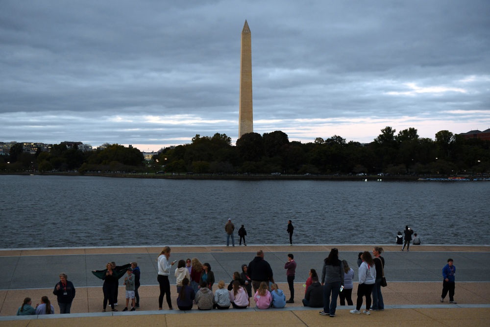 这是10月14日在美国华盛顿杰斐逊纪念堂前拍摄的华盛顿纪念碑。新华社记者李睿摄