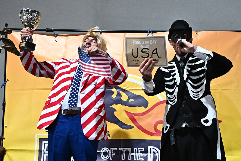 11月14日,联合国COP30气候大会期间,气候行动网(CAN)举行传统的“每日化石奖”颁奖仪式。该奖项象征性地讽刺了全球主要的污染者,此次颁给了美国。(来源:视觉中国)
