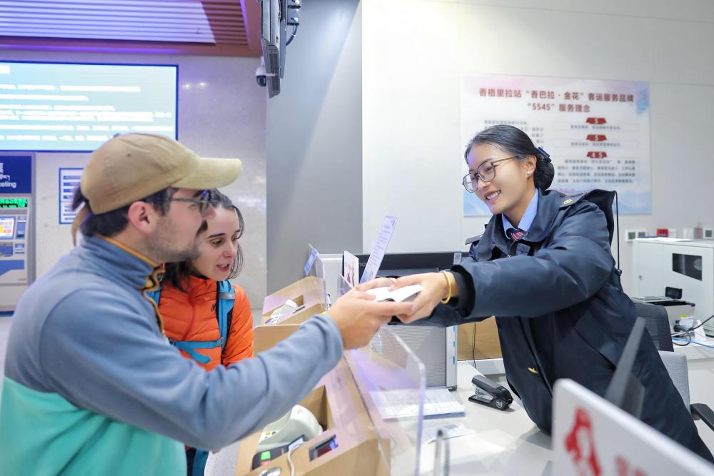 11月18日,外籍旅客在云南香格里拉站“香巴拉·金花”服务台购票。车站为旅客提供“一站式”出行服务。