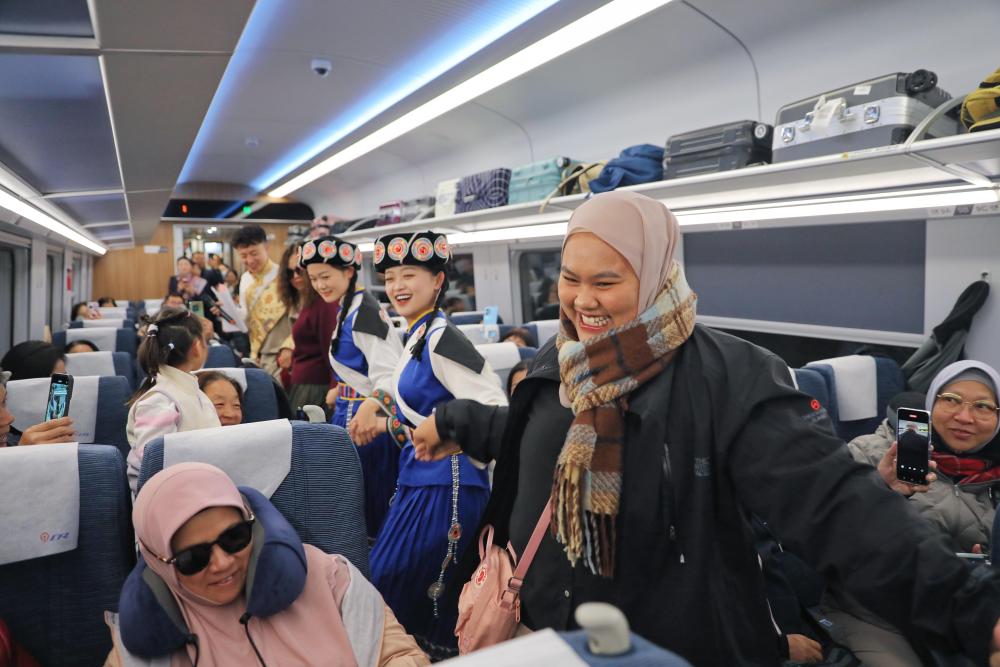 11月22日,在丽香铁路动车组列车上,东南亚游客与身着民族服饰的乘务员一同跳舞。