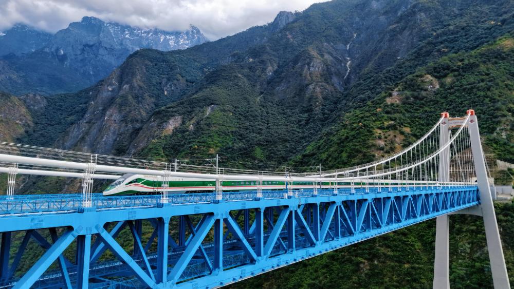 11月21日,动车组列车通过虎跳峡金沙江铁路大桥(无人机照片)。