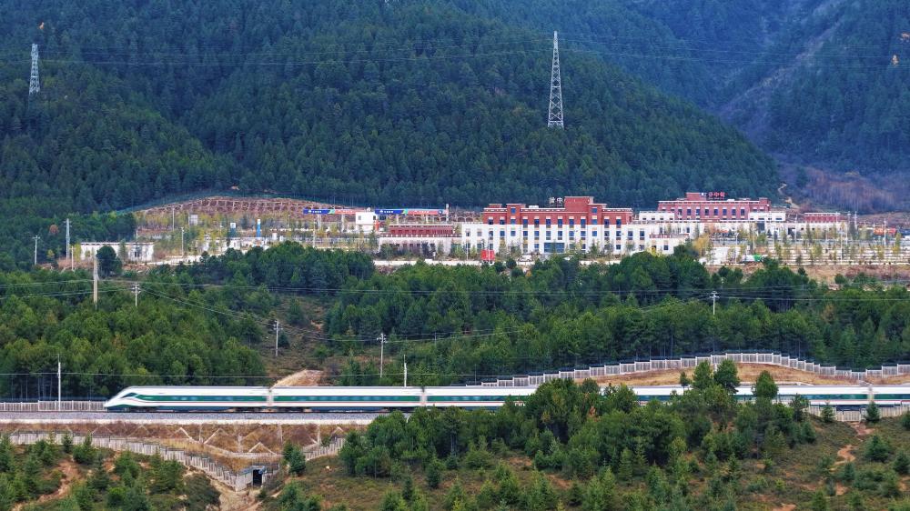 11月21日,一列动车组列车驶过云南迪庆藏族自治州小中甸站(无人机照片)。