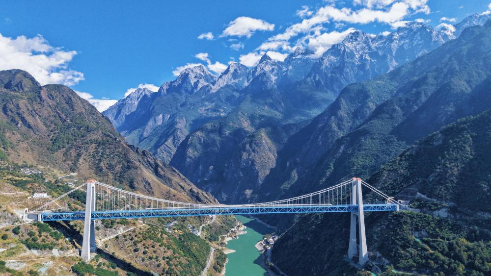这是11月21日拍摄的虎跳峡金沙江铁路大桥。大桥全长882.5米,起于玉龙雪山隧道出口,止于哈巴雪山隧道进口,是丽香铁路的重点控制性工程(无人机照片)。
