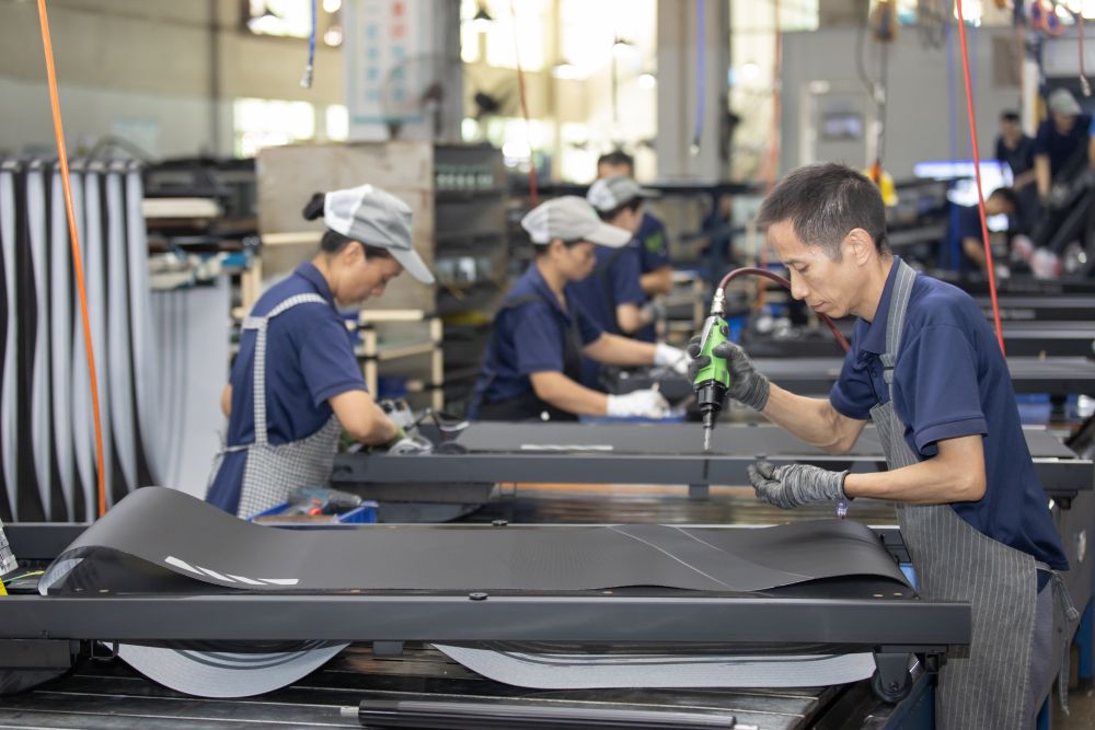 2025年9月12日,福建晋江一家体育器材工厂的工人在车间流水线上组装跑步机。新华社发(连静毅摄)