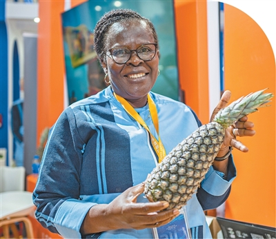 在第八届进博会国家综合展上,贝宁国家馆的工作人员展示贝宁奶油菠萝。
