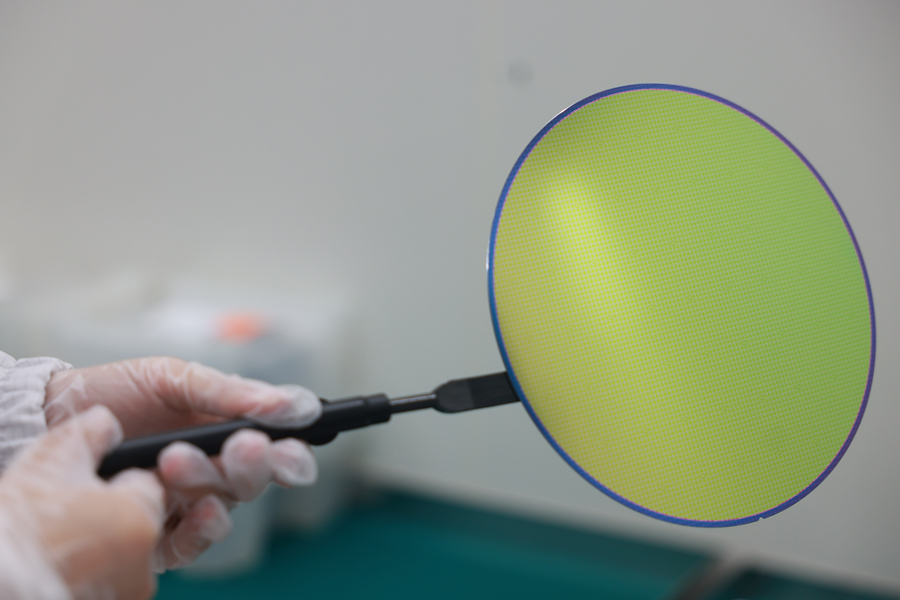 2025年5月22日,在安徽华鑫微纳集成电路有限公司,工作人员展示一款晶圆产品。新华网发(刘晨 摄)