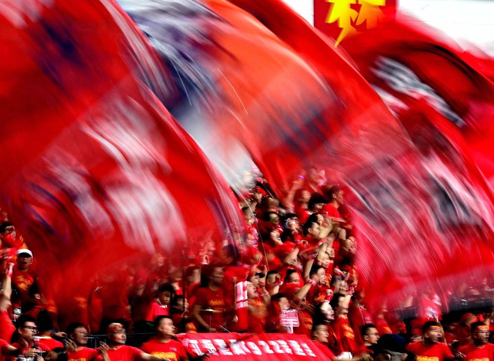 10月19日,在“苏超”半决赛中,南通队球迷为球队加油助威。新华社发(曹政摄)