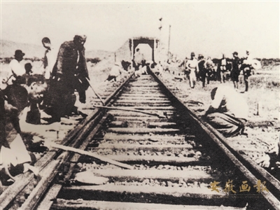 群众协助新四军破坏铁路的情景