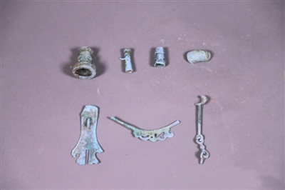 13号墓同样被盗严重,清理很久只见到几件陶器。让考古人员没想到的是,在一个很小的角落里,数件柿蒂纹铜构件被发掘出来,这是钉在棺材上的装饰品,其象征吉祥的纹样,如同柿子下部的蒂子一样,通常为四瓣或五瓣。