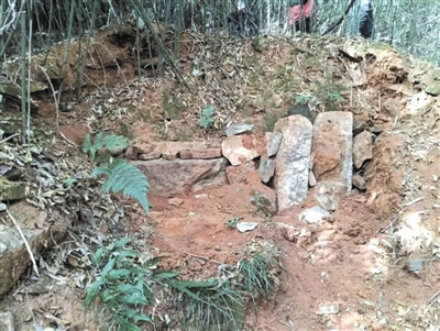 墓葬曾遭破坏,石室前后壁均坍塌敞露,但墓内遗骸保存尚好。去年11月27日,绍兴市文物考古研究所副所长王仁芳和寿氏后人、杨晔城等人来到现场,发现墓址及“寿界”坟界碑、“神”字残墓碑等物。通过调查走访当地高龄村民,确认该地为寿氏祖茔。