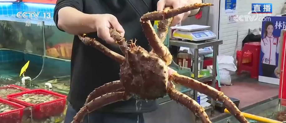 走进“八市”,就像走进了一个活生生的“海鲜大观园”。这些是市场里的“重量级选手”,这只帝王蟹张牙舞爪、个头硕大,掂量一下,单个的重量就有好几斤。旁边的这个是波士顿大龙虾,是宴请餐桌上的一道“硬菜”。这种在本地叫作“富贵虾”,大小不一,这只已经和我的手腕差不多粗了。