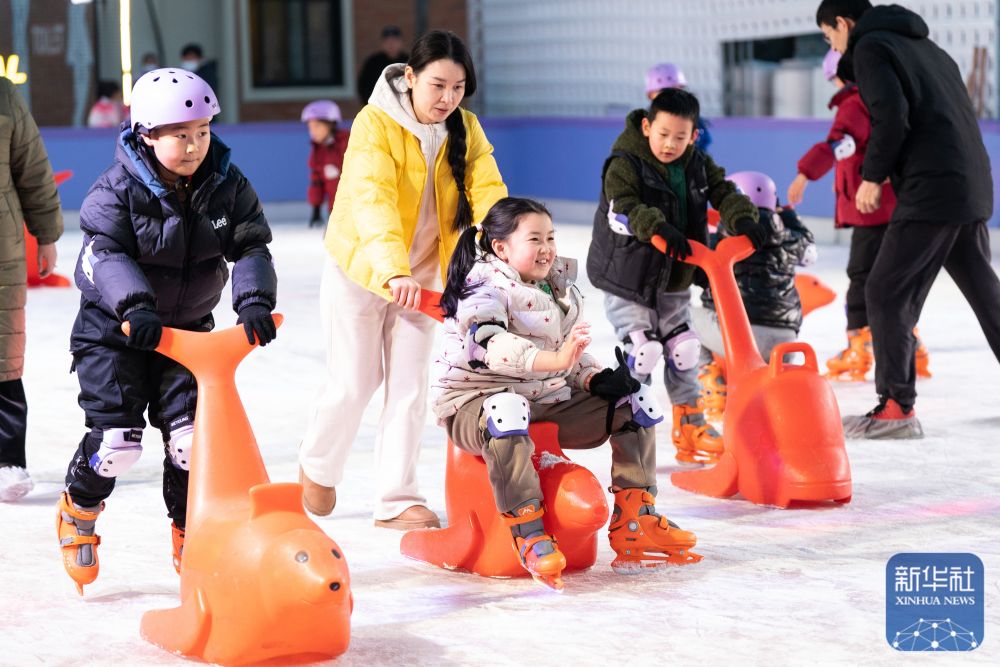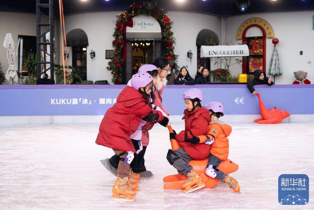 ↑ 1月10日,游客在合肥市新粮仓商业合集滑冰。