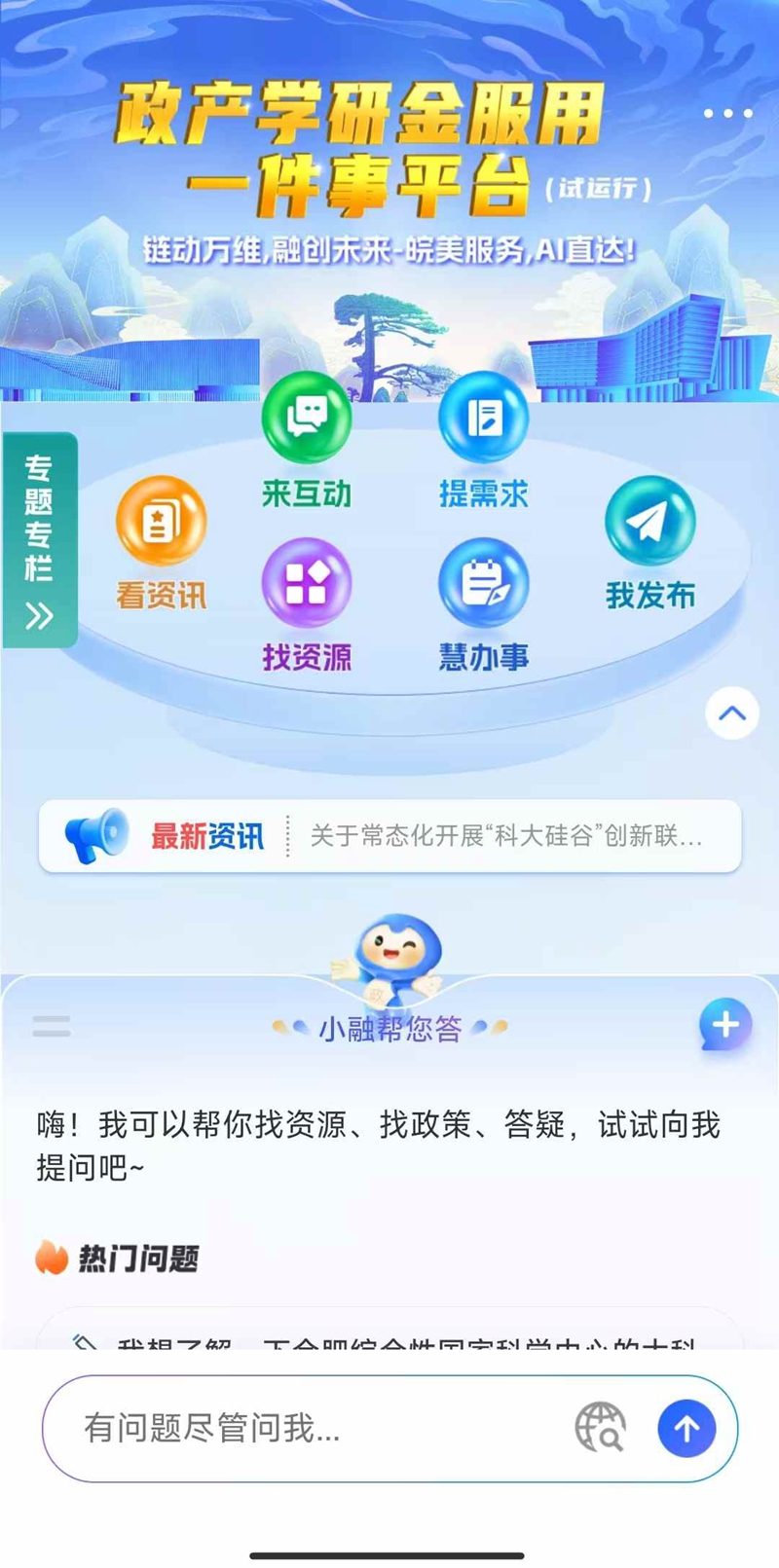 目前,该平台正在试运行,用户登录皖事通、皖企通,通过首页—特色专题—“高效办成一件事”重点事项—个人事项/法人事项—政产学研金服用“一件事”,即可进入平台。