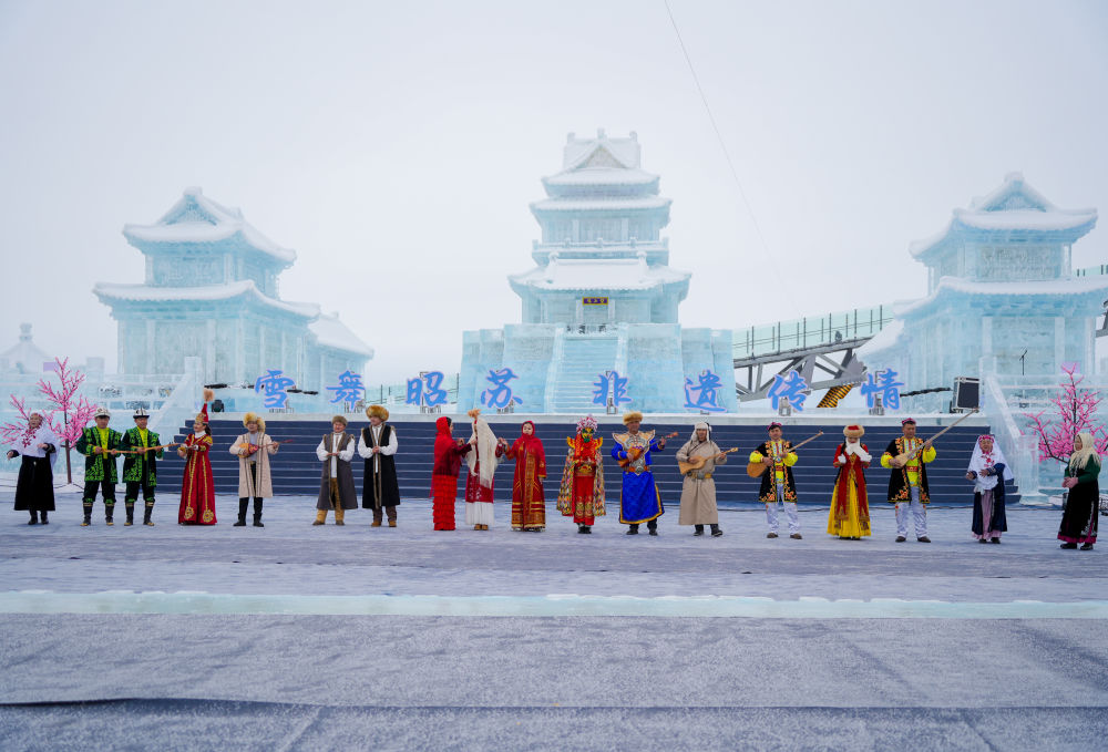 新疆昭苏县湿地公园,演员表演非遗节目。新华社记者 徐宏岩 摄