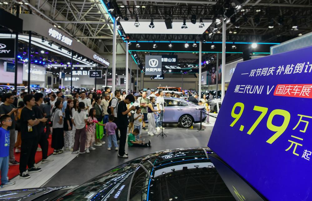 2025年10月1日,市民在2025第46届中国(福州)国际汽车博览会现场观看车商的促销活动。新华社记者 魏培全 摄