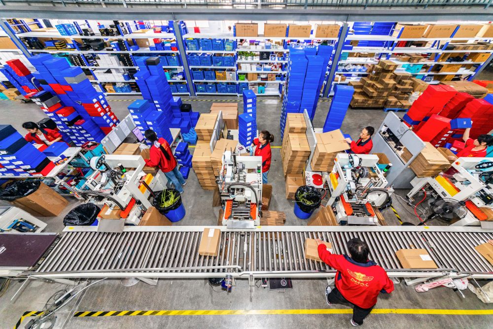 2025年4月,在位于浙江省温州市的德赛集团物流园内,工作人员在对发货鞋类产品进行分拣、打包。新华社发(刘吉利摄)