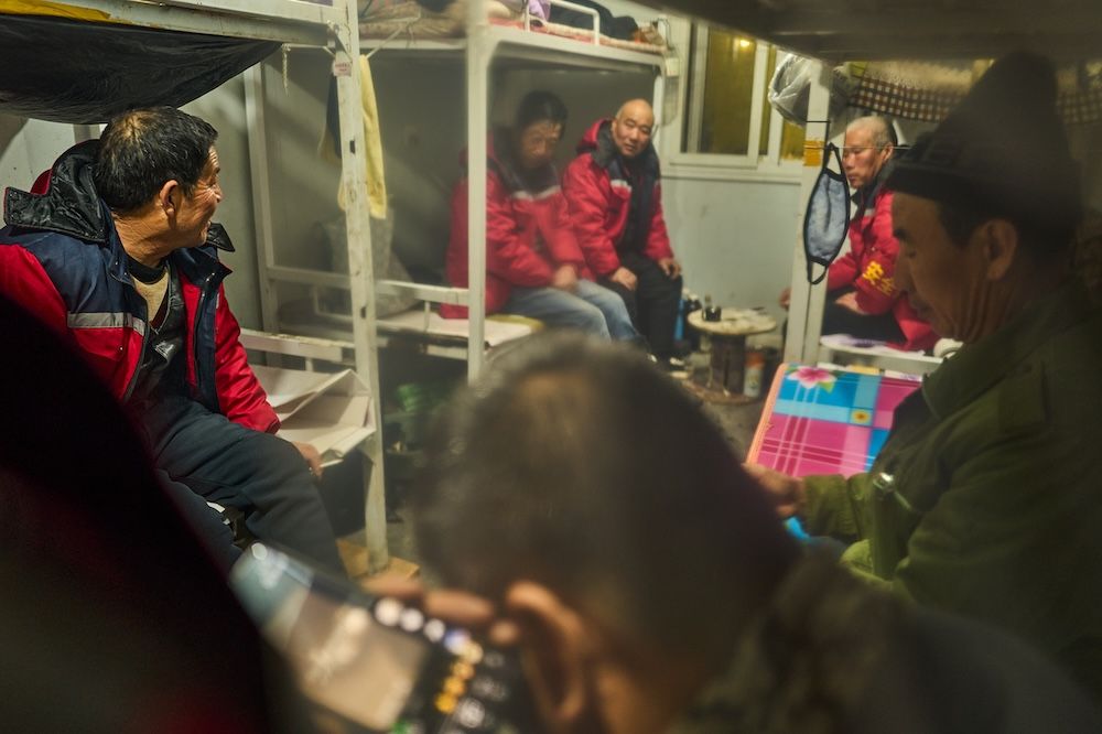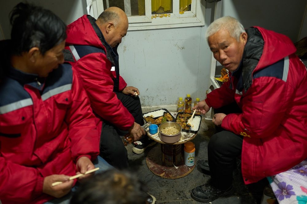 天气寒冷,老板给工友们加了菜。年过六旬的张小林从床底下摸出一瓶10元钱买的烧酒,倒在杯盖里,几个工友聚在一起小酌起来,这是他们一天中不多的闲暇时光。