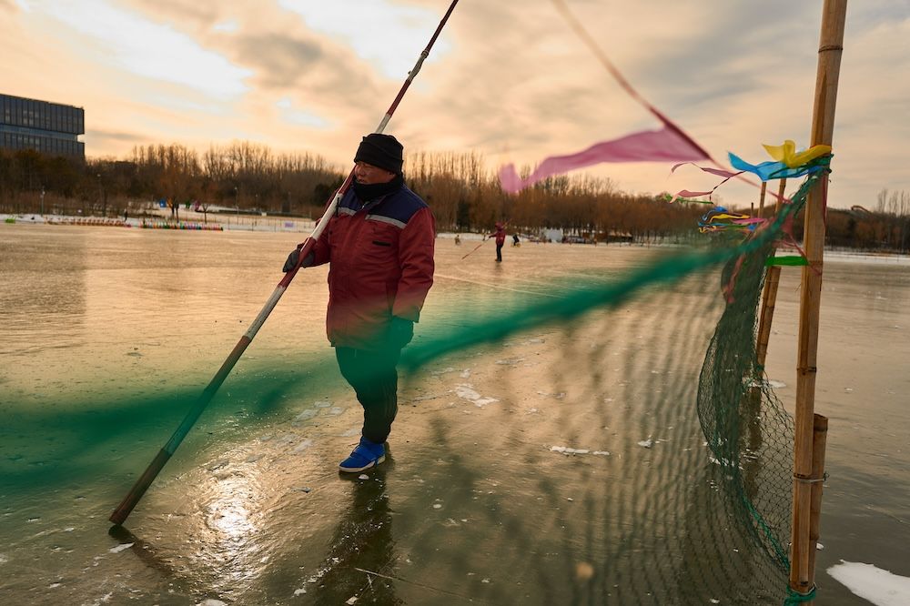 2026年1月18日,奥森公园冰场,刘彪扛着标杆在冰面上巡查风险点。