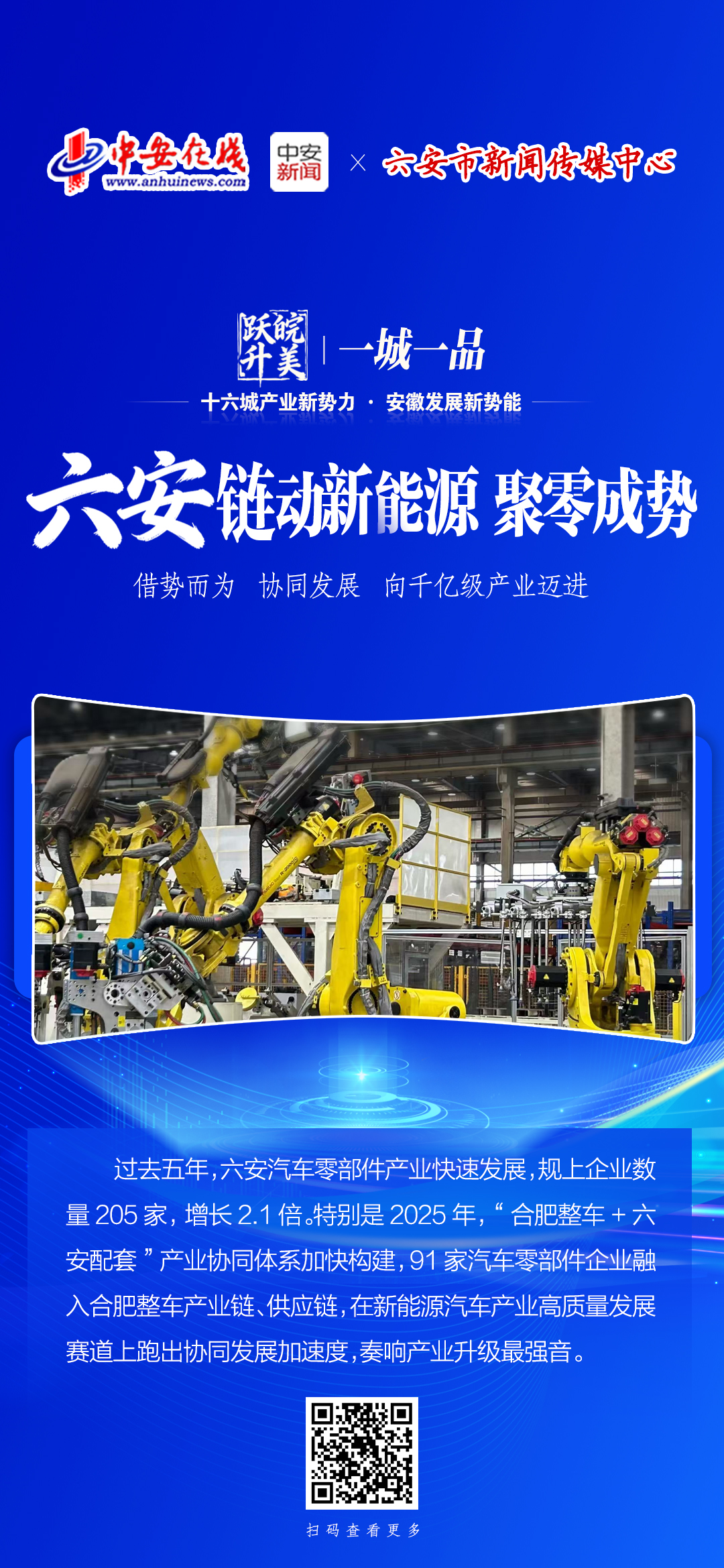 中安在线联动省内十六个地市主流党媒,聚焦各地最具代表性、成长性的新兴产业与未来产业,以“一城一产业一故事”为主线,共同策划推出“十六城产业新势力·安徽发展新势能”全媒体联名报道,开设《皖美跃升 一城一品》专栏。本次报道绘制一幅动态、立体、可感知的安徽产业高质量发展地图,突出产业“新势力”、诠释发展“新势能”,展现安徽在培育新质生产力上的积极作为,与各地两会精神同频共振,为奋力谱写中国式现代化安徽篇章营造浓厚氛围。