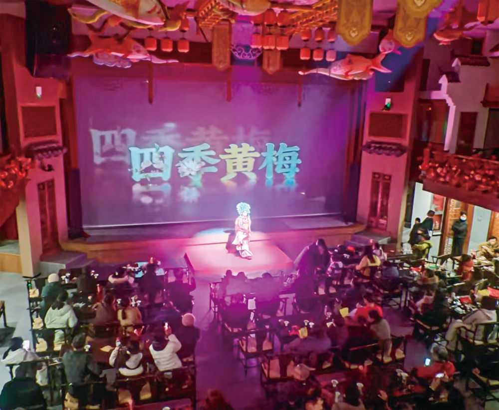 华灯初上,国家历史文化名城安庆的倒扒狮历史文化街区游人如织。升级改造后的黄梅戏会馆年味拉满,舞台上,现代全息光影技术让经典黄梅戏场景穿越古今、焕新呈现,令台下观众如痴如醉;舞台外,人如潮灯如海,夜景如画,品味宋式点茶、NPC互动秀成为游客的“心头好”。