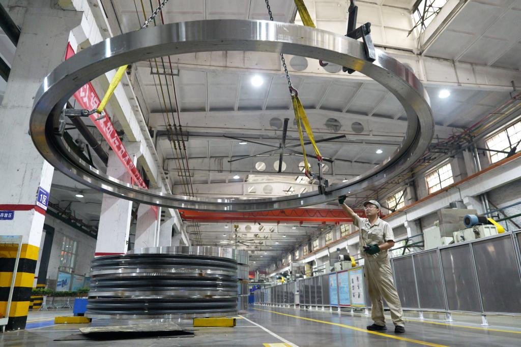 2025年5月22日,工人在洛阳轴承集团股份有限公司风电三车间生产线上作业。新华社记者 李嘉南 摄