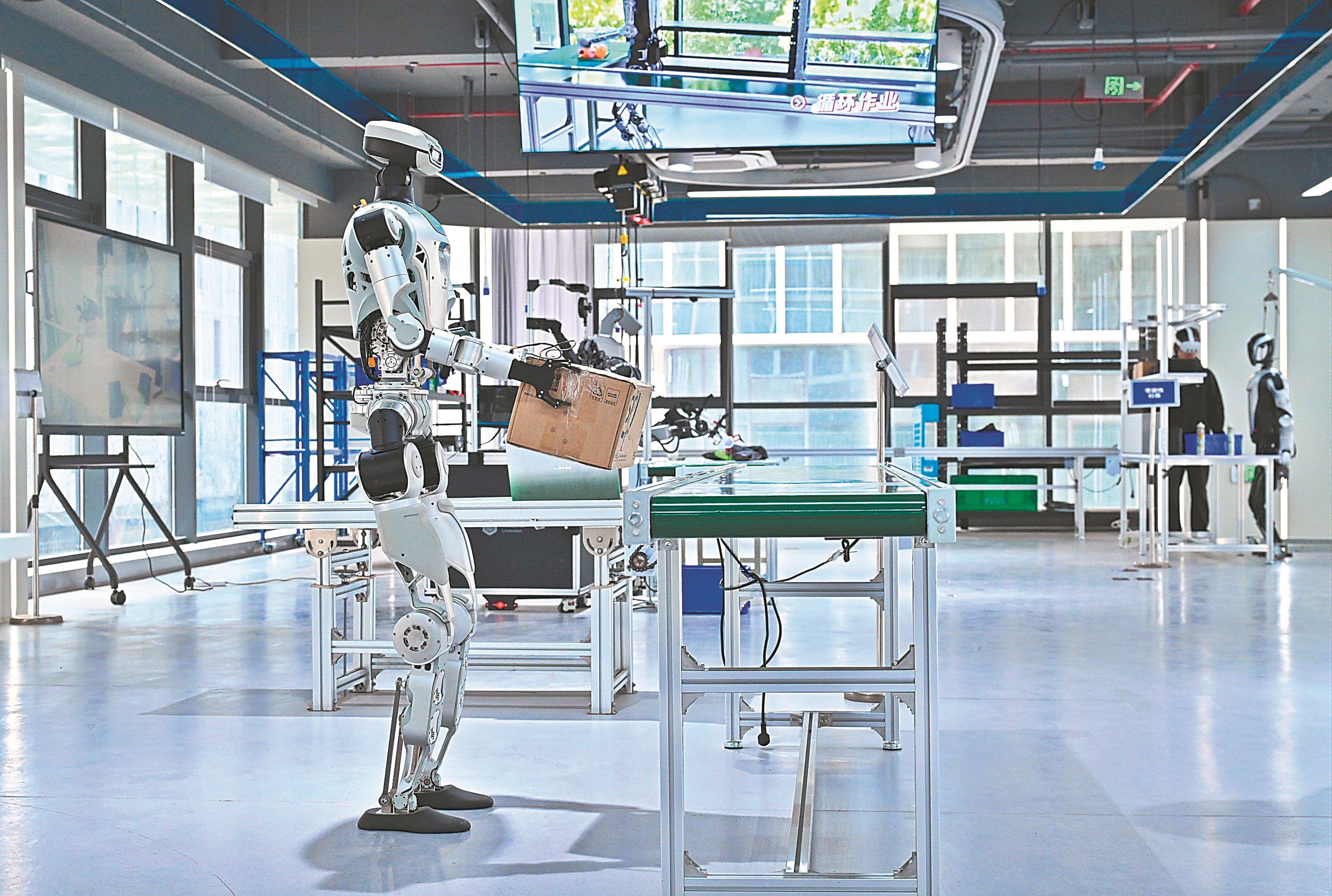 合肥市具身智能机器人数据采集预训练场,人形机器人在进行零物流搬运的相关训练。本报记者 程兆 摄