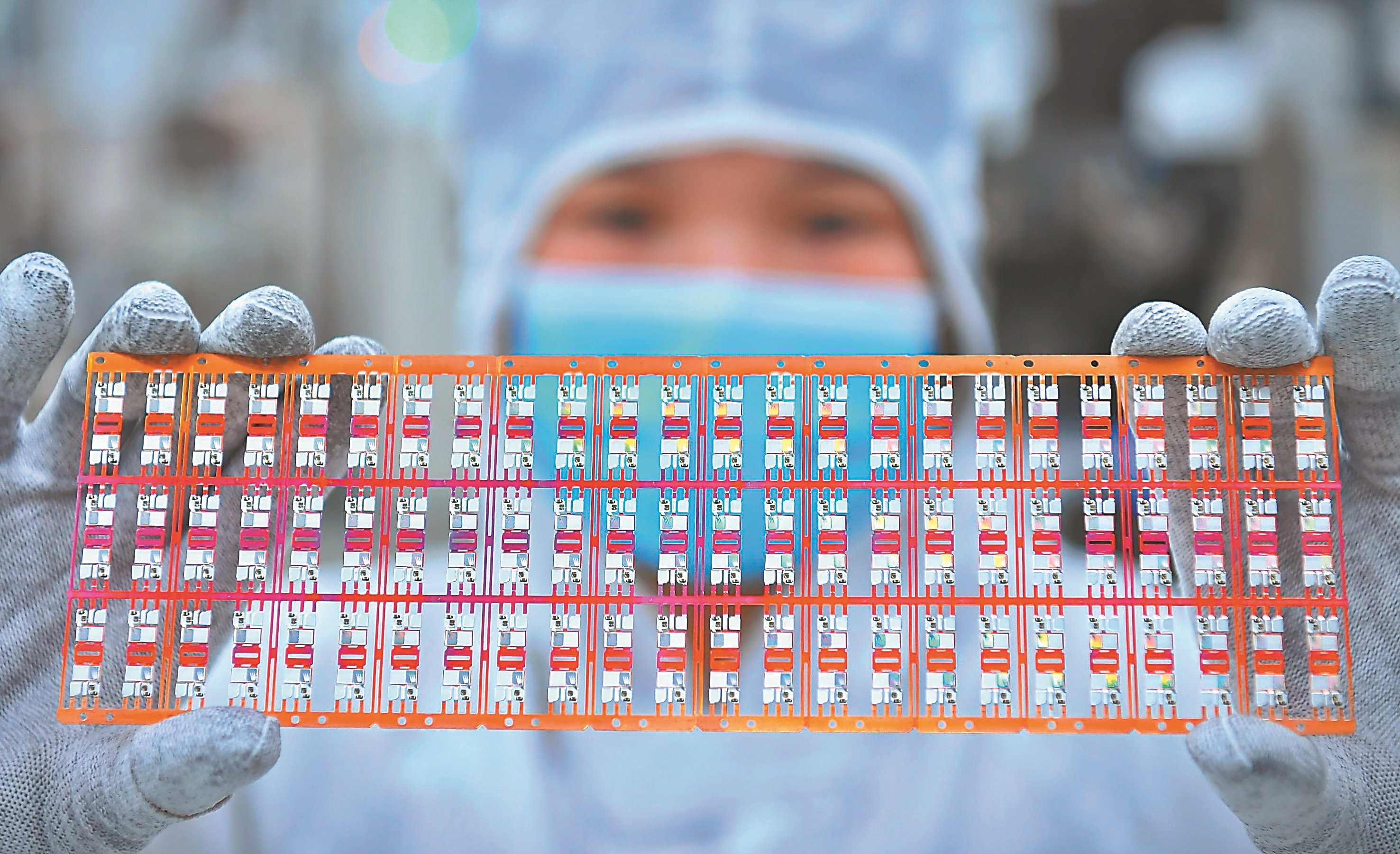 马鞍山经开区东科半导体(安徽)股份有限公司,工人展示生产的电源芯片。本报记者 程兆 摄