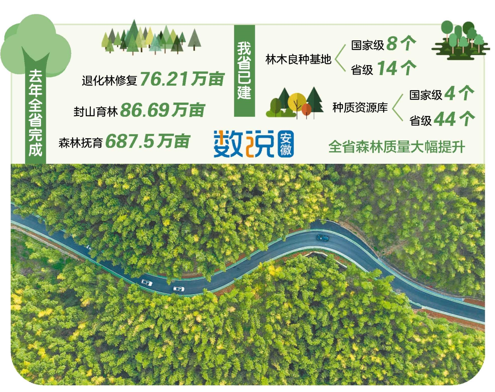 3月17日,记者从省政府新闻办举行的新闻发布会上获悉,去年全省完成人工造林21.68万亩,封山育林86.69万亩,退化林修复76.21万亩,森林抚育687.5万亩。森林蓄积量达2.7亿立方米,位居长三角第二。林业总产值约7000亿元,位居全国第一方阵。
