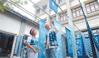英国籍视频博主斯图尔特·维金在云南大理体验白族扎染技艺。