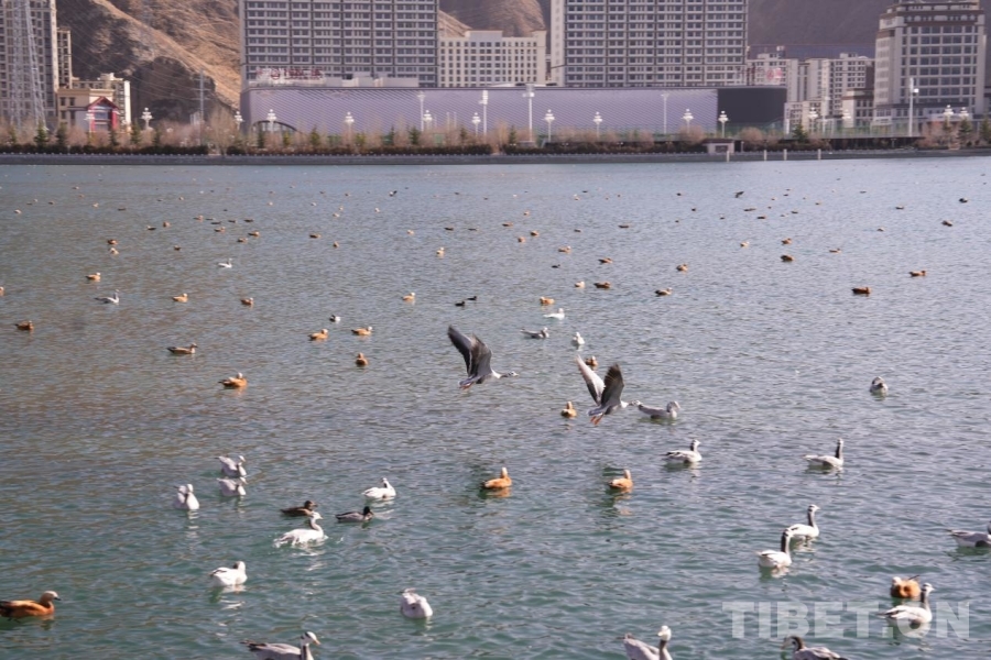现代化的城市楼宇与连绵的群山相依,成群的斑头雁、赤麻鸭在拉萨河中游弋,勾勒出人与自然和谐共生的高原图景。 摄影:张艺彤