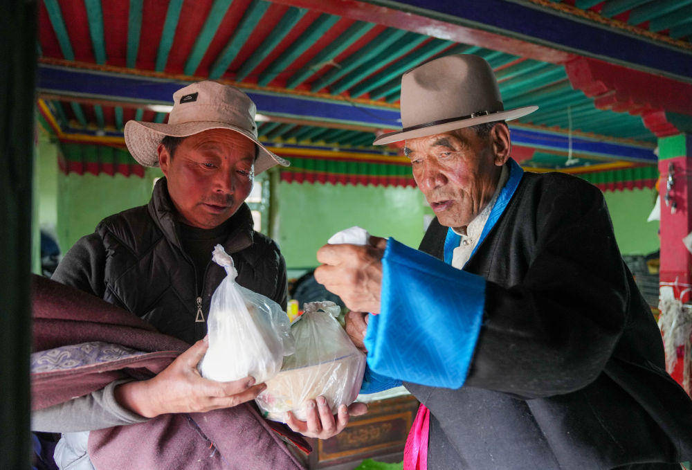 达瓦片多和女婿在整理酥油茶(晋美多吉 摄)