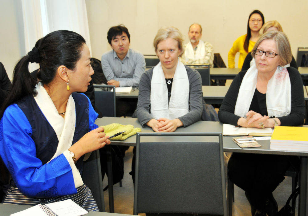 2011年11月14日,在芬兰举行的西藏情况介绍会上,藏学家边巴拉姆(左)和芬兰学者进行交流。(赵长春 摄)